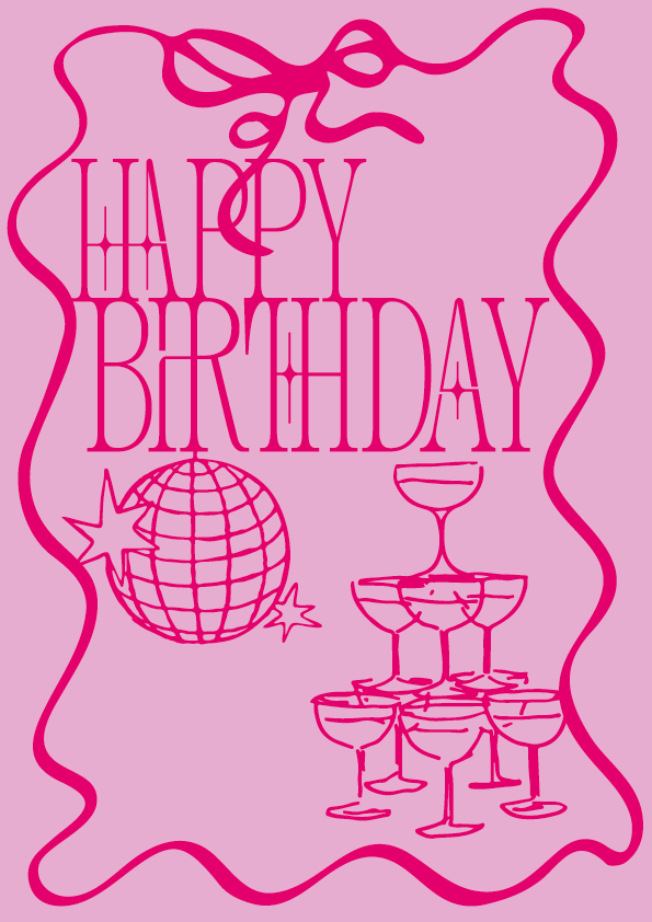 Carte d'anniversaire festive sur fond rose tendre est décorée aux contours élégants en rubans fuchsia.